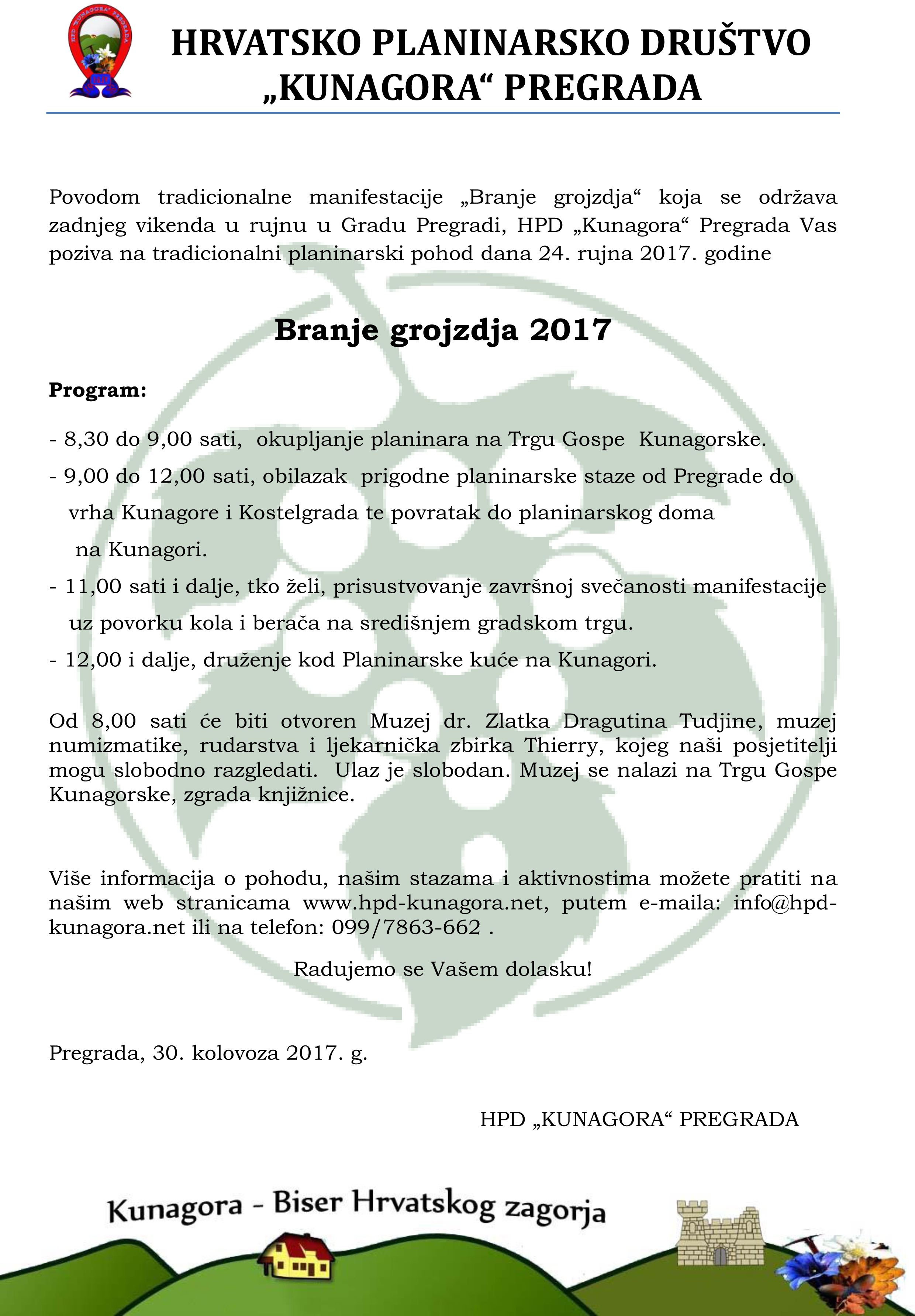 Povodom tradicionalne manifestacije „Branje grojzdja“ koja se održava zadnjeg vikenda u rujnu u Gradu Pregradi, HPD „Kunagora“ Pregrada Vas poziva na tradicionalni planinarski pohod dana 24. rujna 2017. godine