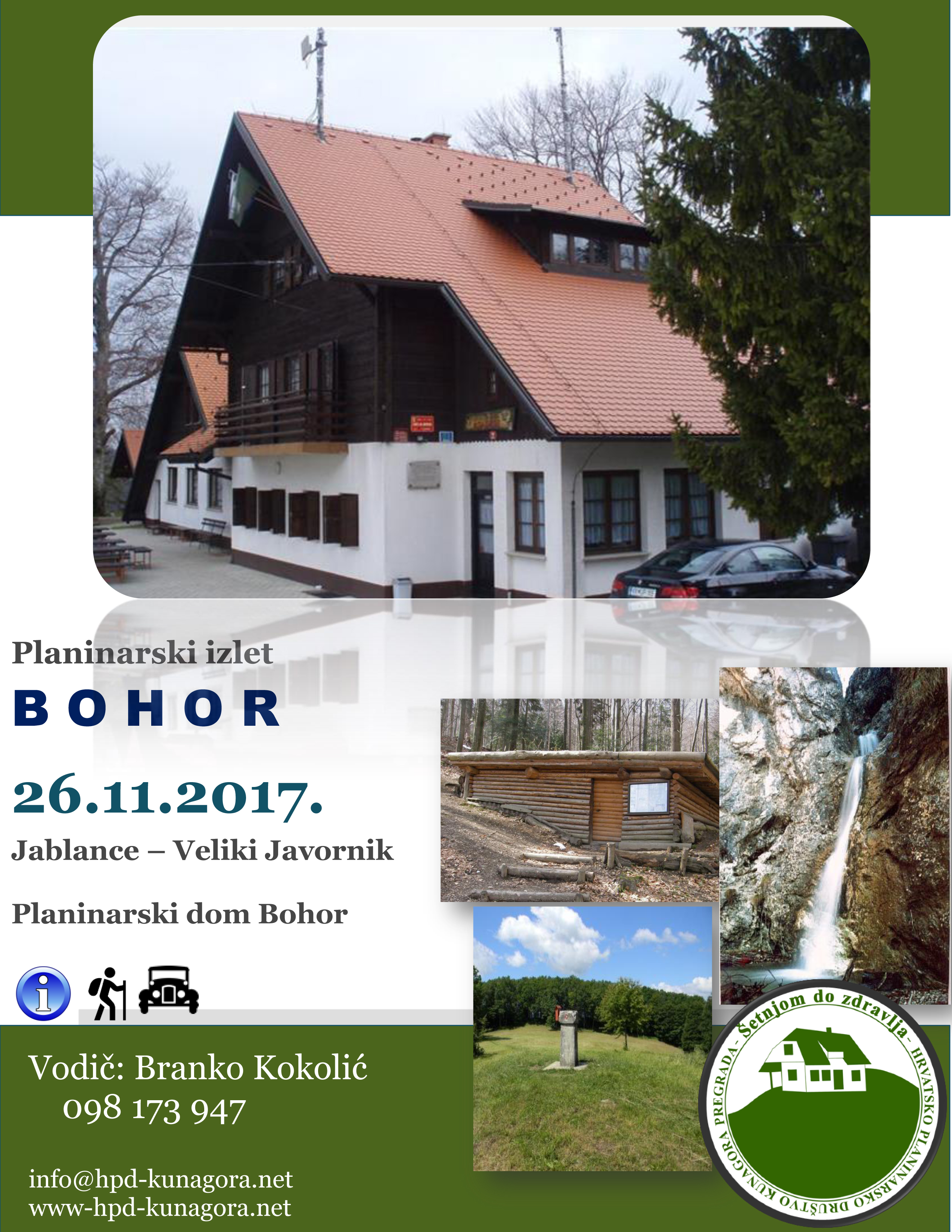 U nedjelju 26.11.2017. godine organiziramo planinarski izlet na Bohor, vrh Veliki Javornik - 1023m, te planinarski dom na Bohorju - 896 m. Usput ćemo obići i slap Ubijavnik i staru partizansku bolnicu na Travnom Lazu.